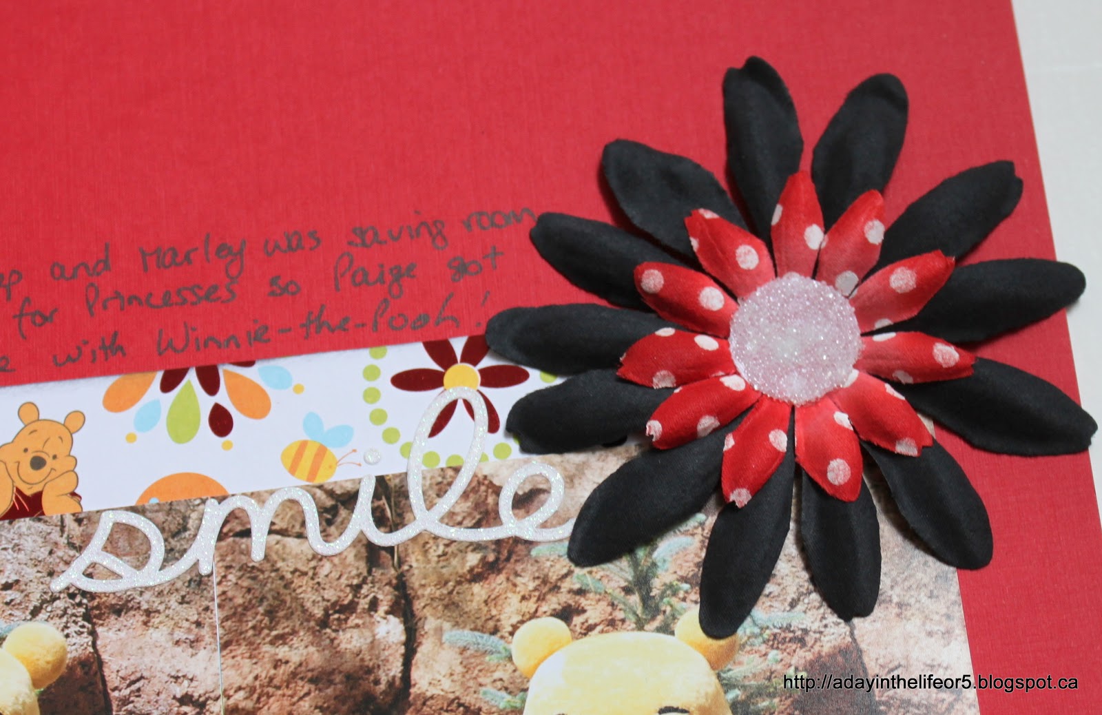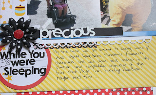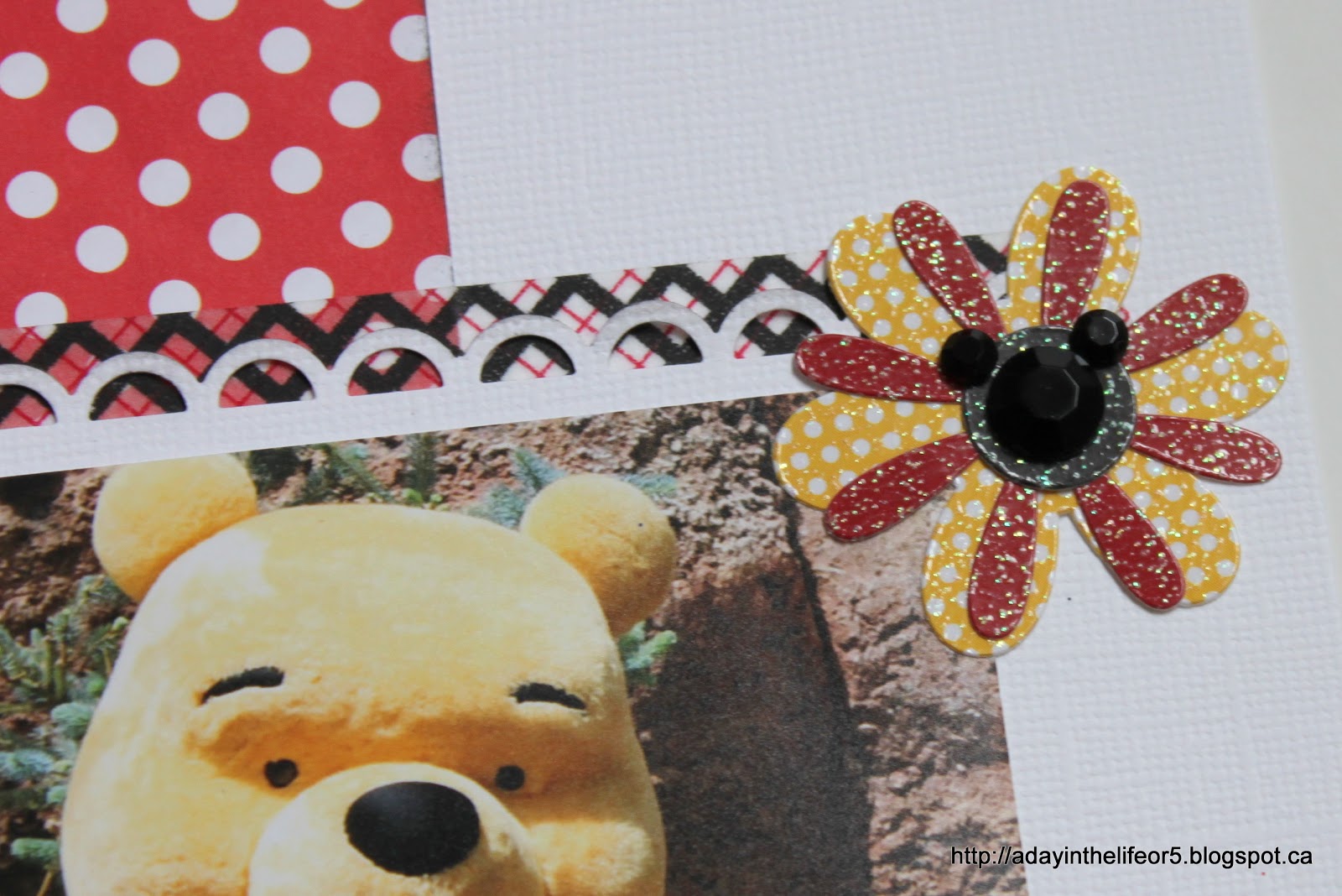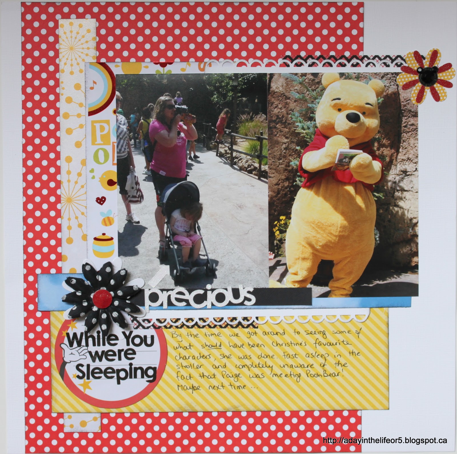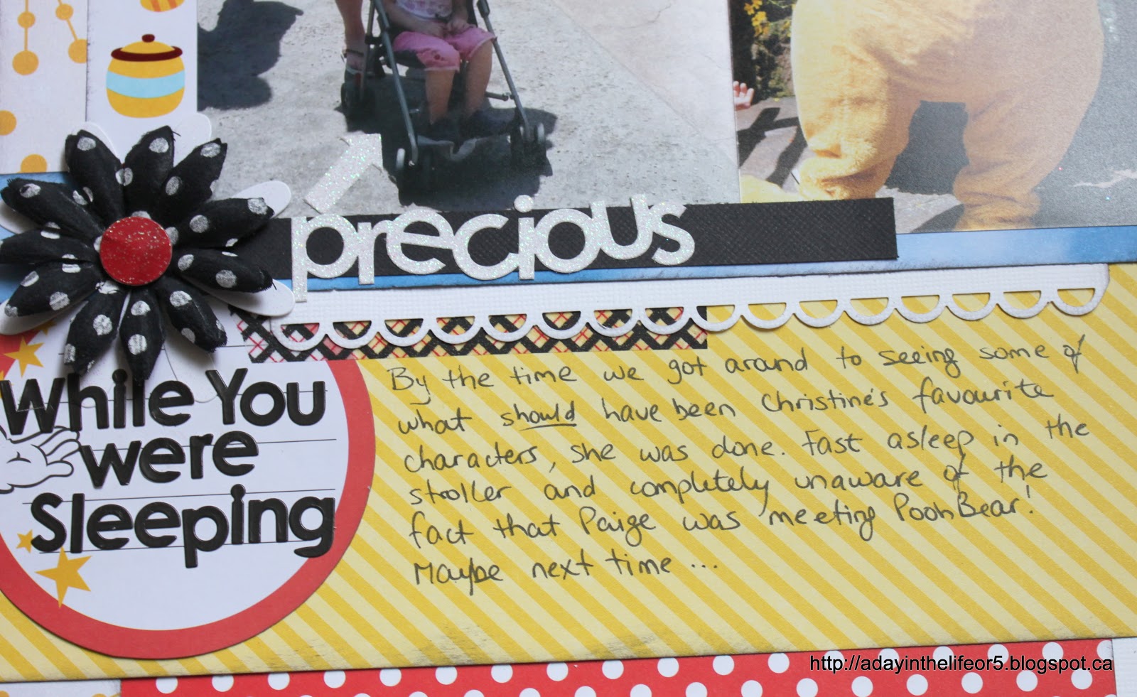 My title may be a little hard to read so I’ll write it out here again – Up Close And POOHsonal. Ha, ha, ha!! A little play on words there!! The journaling explains it. It reads: “Christine was fast asleep and Marley was saving room in her autograph book for Princesses so Paige got some one-on-one time with Winnie-the-Pooh!”
