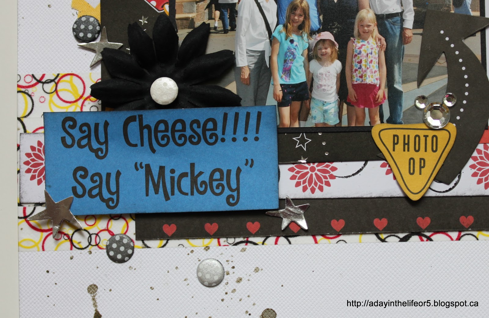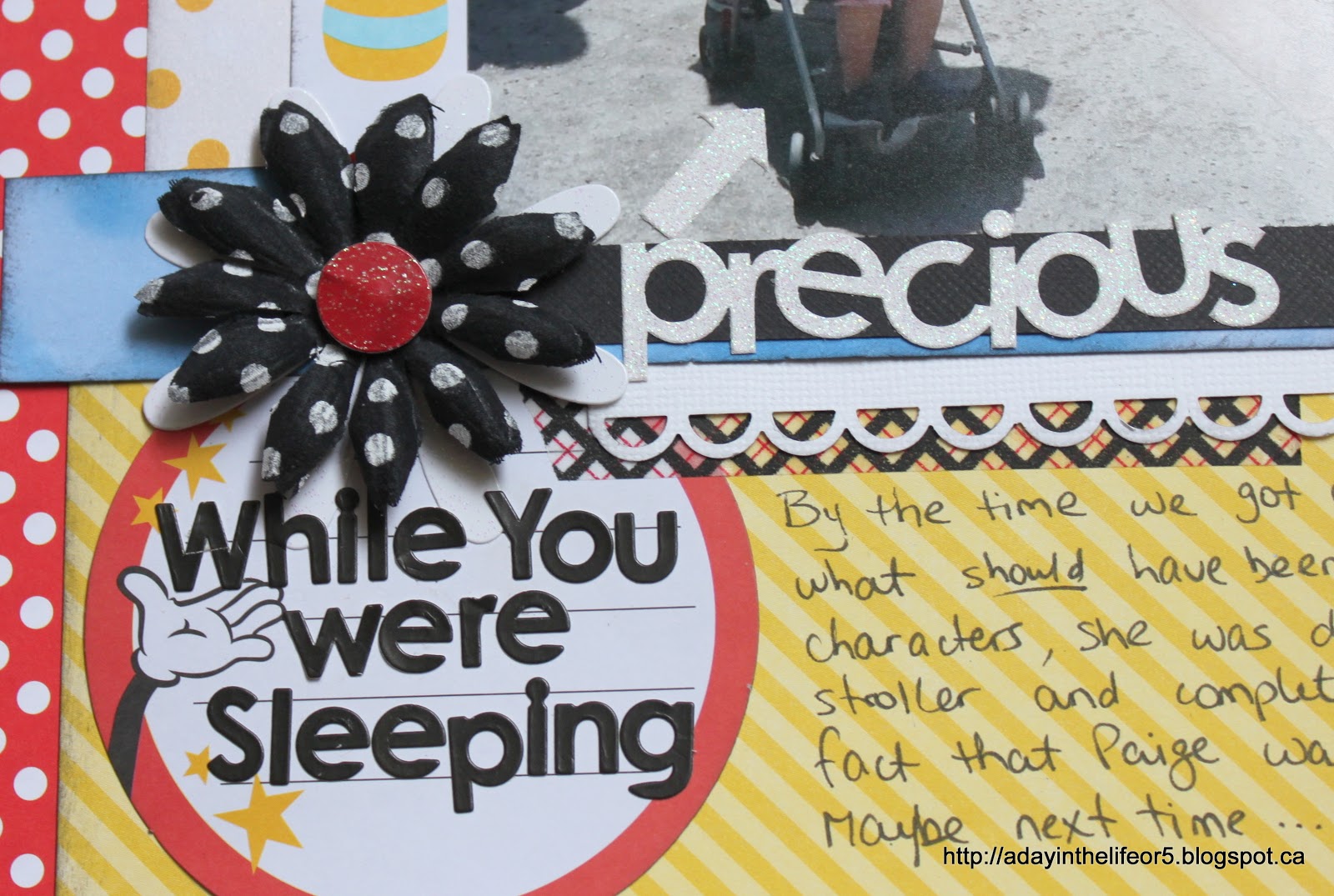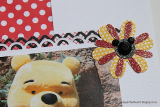 There are a few things I mean to add to pretty much every page I do and you can see some of them here. The fabric flower, the dots (I think they are called Candy Dots) and the Mickey head shaped bling. I’ve got a few different washi tapes that will get added here and there as well as little word phrases (cut out from a 12×12 piece of patterned paper.)
