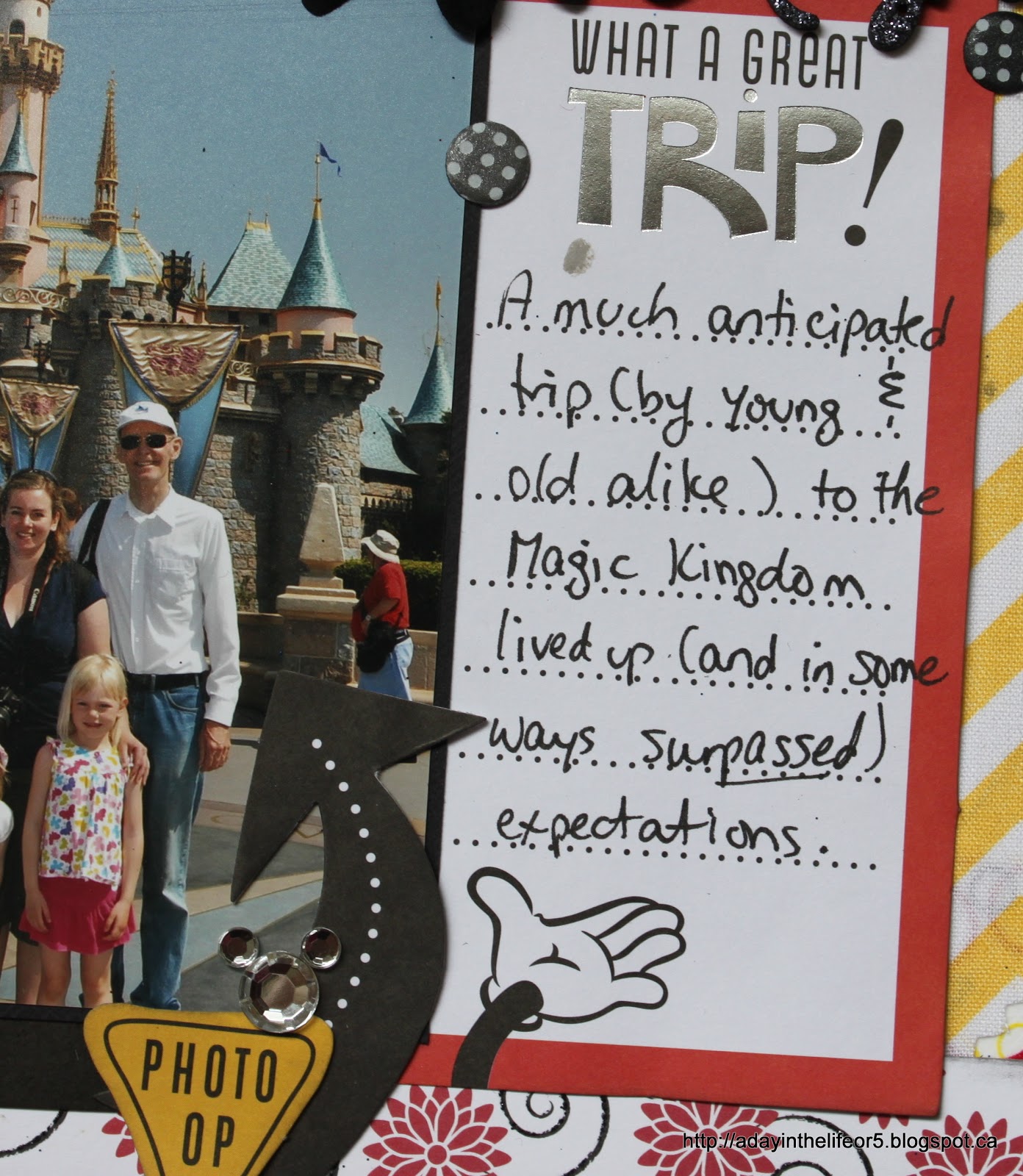 Instead of the horizontal element shown at the top of the page in the sketch, I chose to anchor my photos with a horizontal element at the bottom of the page. You can also see the Mickey gem too!