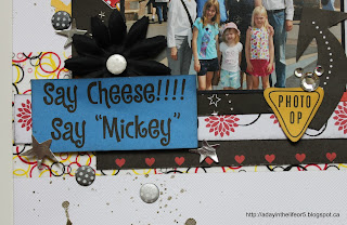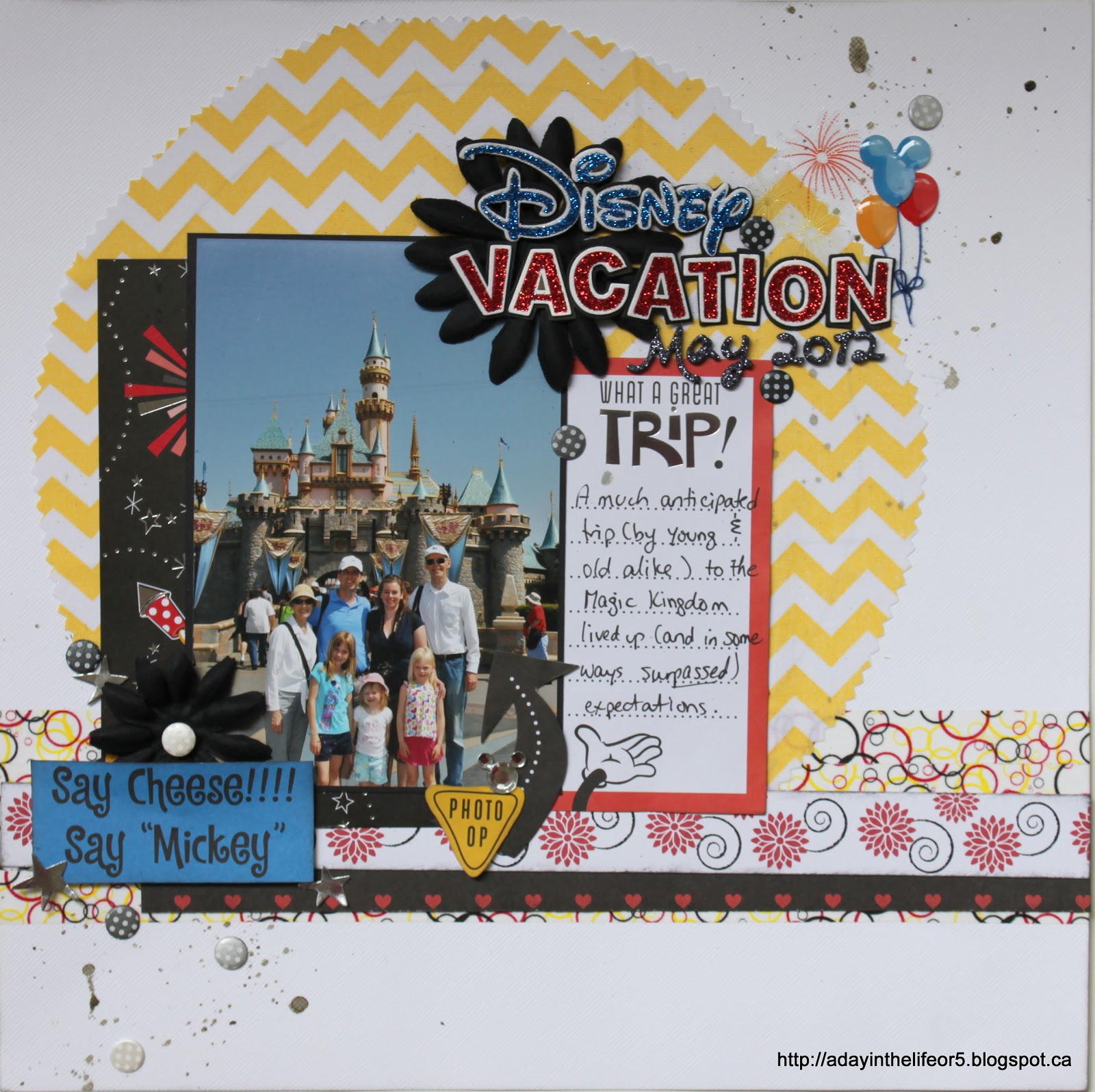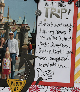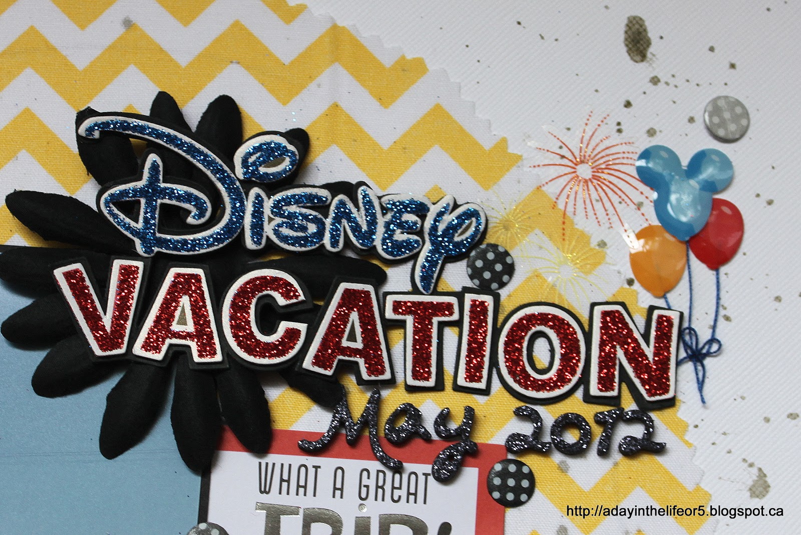 The title. The Disney Vacation plus the balloons/fireworks was a title sticker while the May 2012 were added using glittery foam letter stickers.