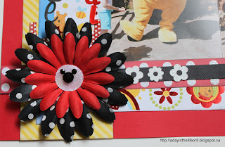 I added the Mickey gem to the flower accent in the top right corner. I also repeated the washi tape and punched white card stock up here.