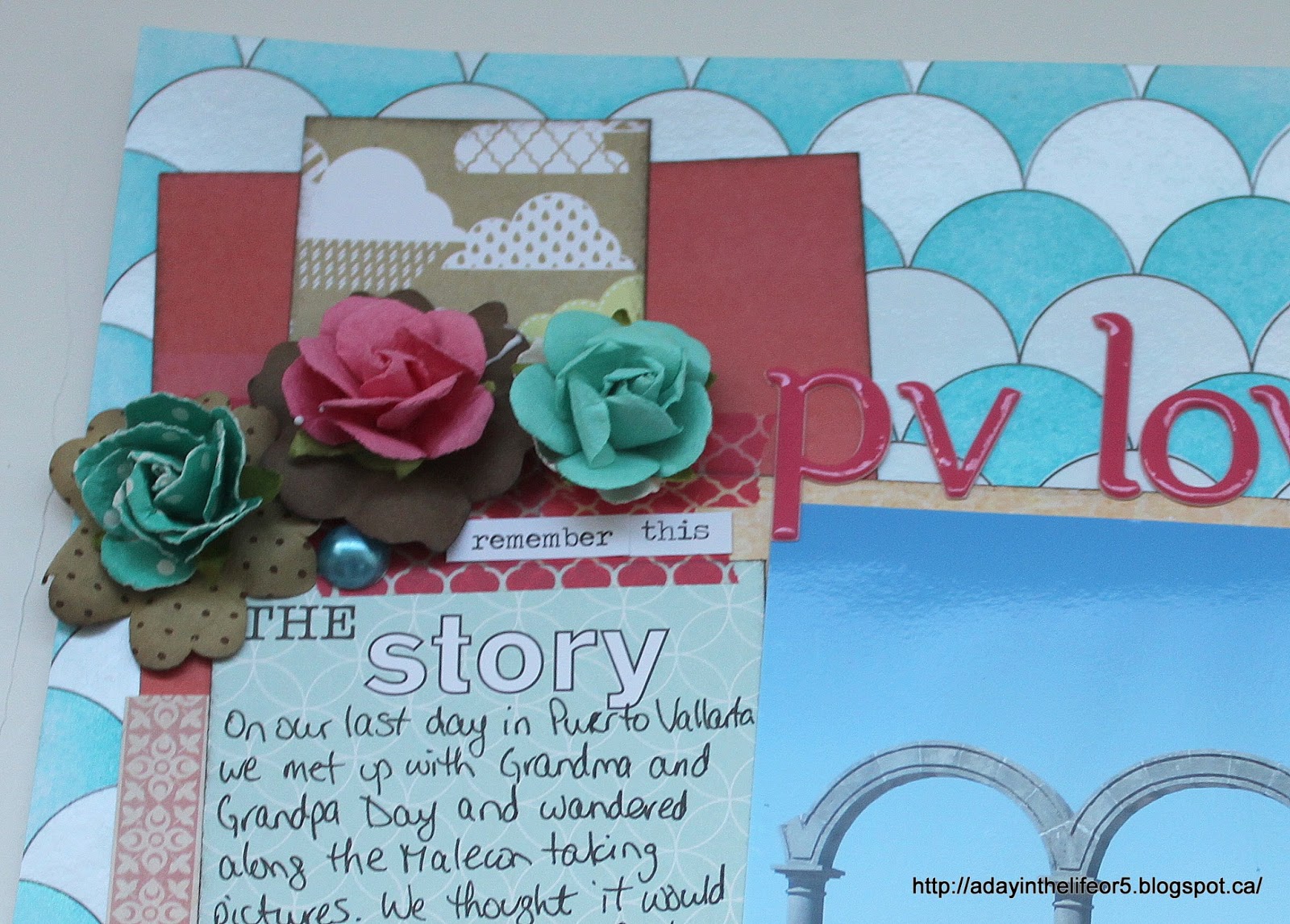 The bottom of the larger photo needed a larger cluster so I mixed in one larger rose from my stash and some pearls. Using the same washi tape and word stickers keeps the two embellishment clusters cohesive.