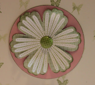 This was the first one I made. I used Very Vanilla Card stock for the base and stamped it in Lucky Limeade with the butterfly image from the Sale-a-bration stamp set Elementary Elegance. The circle is punched out of Blushing Bride card stock with my 2 1/2″ circle punch. Then the flower .. ah, the flower … There is a new stamp set with matching punch in the Occasions mini that I LOVE! It’s called Mixed Bunch and the punch is called Blossom. I stamped the top image and then both punched and fussy-cut it out and mounted it on top of another punched out flower from the Twitterpated DSP (see below for a close up of the flower). I held everything together with a brad from the Sale-a-bration Everyday Enchantment Ribbon & Brad pack.