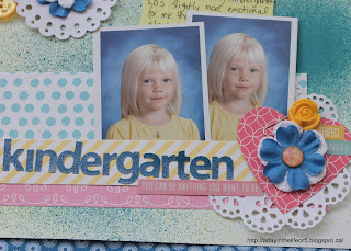 I sort of switched the photo placements around but kept to rest of the sketch pretty much. This is Paige’s Kindergarten pictures. She’s still got those chubby little kid cheeks – so cute!! I liked the back ground texture in the sketch (below) so I used my Mister Huey’s to create a similar feel. Then backed it with a full piece of Stampin’ Up DSP. The blue totally matched the blue background in Paige’s picture! Plus it meas I’m using 2 full sheets of 12×12 paper! Woo hoo!! Stash bustin’ baby!!