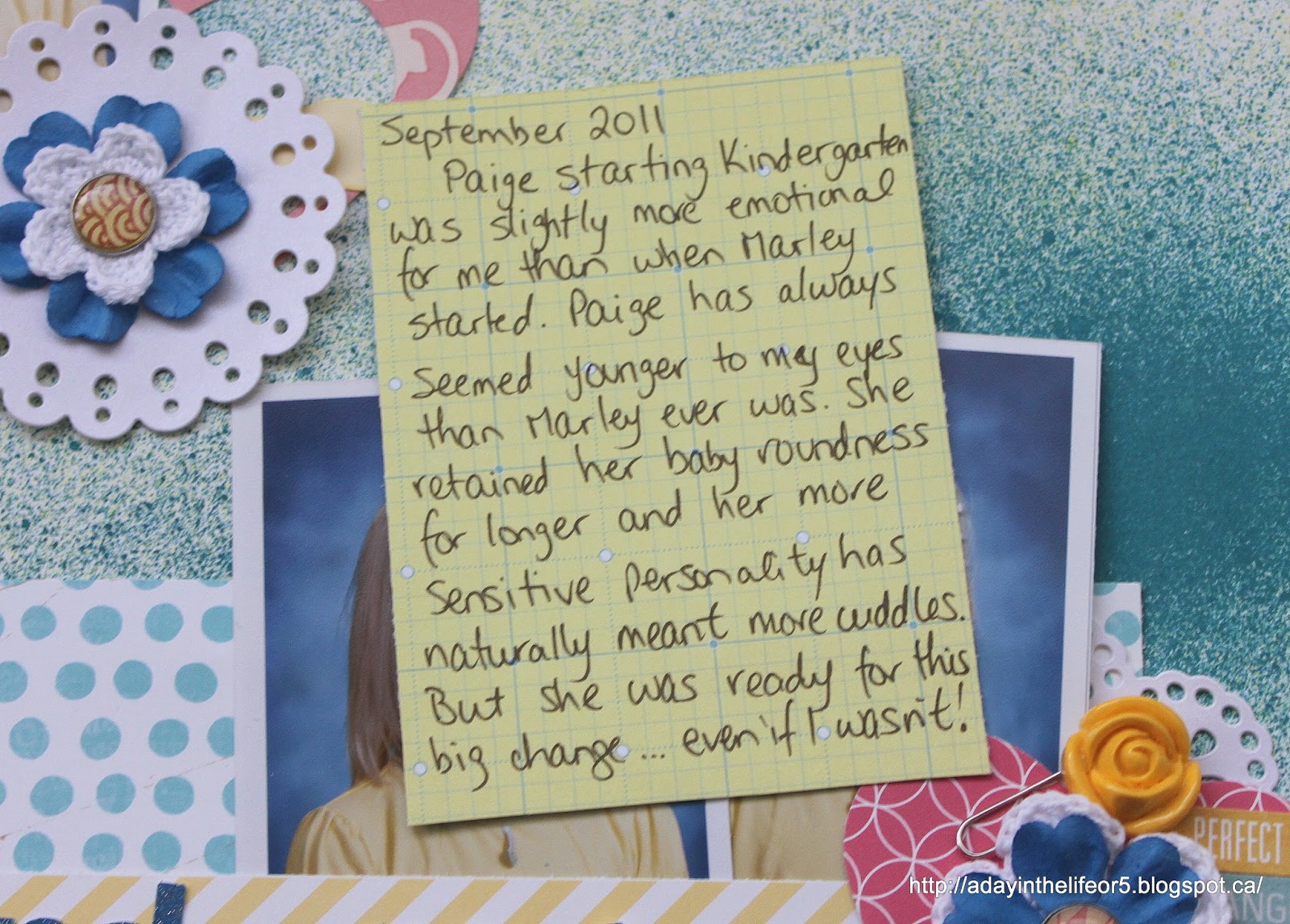 The journaling is on this little tag that I tucked behind the photos at the bottom of the layout. I liked that the card was a yellow grid because the colour matched Paige’s shirt and it felt “school-like”. Like a yellow legal pad or something. It’s the littlest details sometimes!