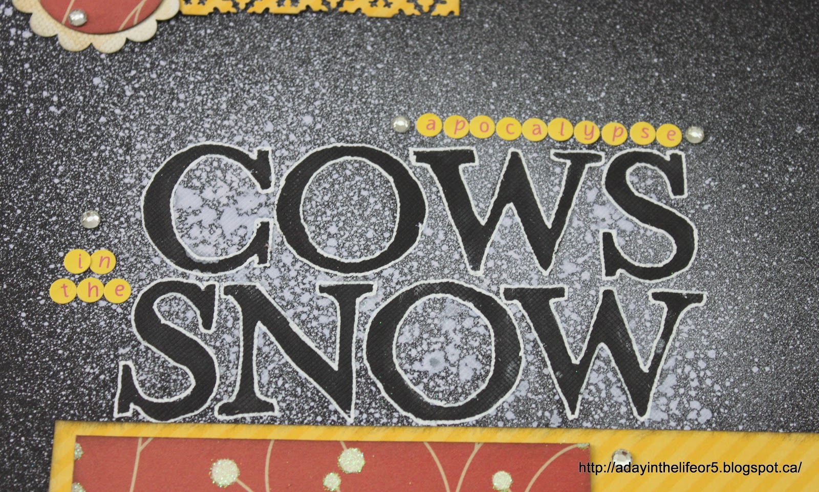 The group of us out that night used to play Ultimate Frisbee together and we were called the Apocalypse Cows so the whole title is “Apocalypse Cows in the Snow” but since we referred to ourselves as The Cows, I just made those two words the focus. I like the symmetry of them too! Almost a palindrome!!