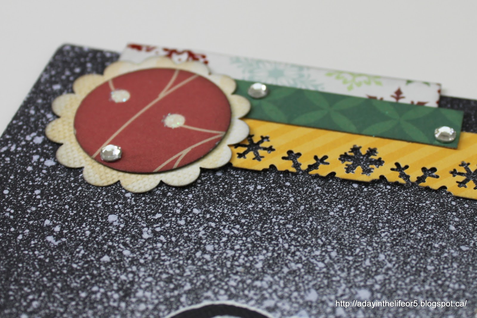 As an added bonus, I used the sprayed O’s as embellishments. Here I cut out the centre of the scalloped circle paper behind the O to show the tree on this piece of Studio Calico paper. The paper is all little white houses on a pale yellow background with one lone fir tree. I liked the fir tree. It reminded me of the woods on Cyprus Mountain so I wanted to feature it.