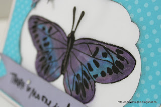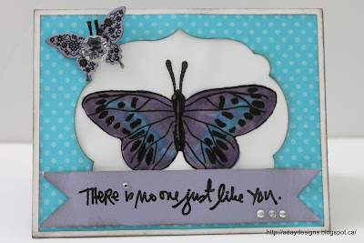 As an added embellishment I embossed an image from Papillon Potpourri onto Wisteria Wonder and punched it out with the matching Elegant Butterfly punch. I topped it with a Vintage Faceted Designer Button threaded with some black embroidery floss. I left the tails long to mimic the antennae.