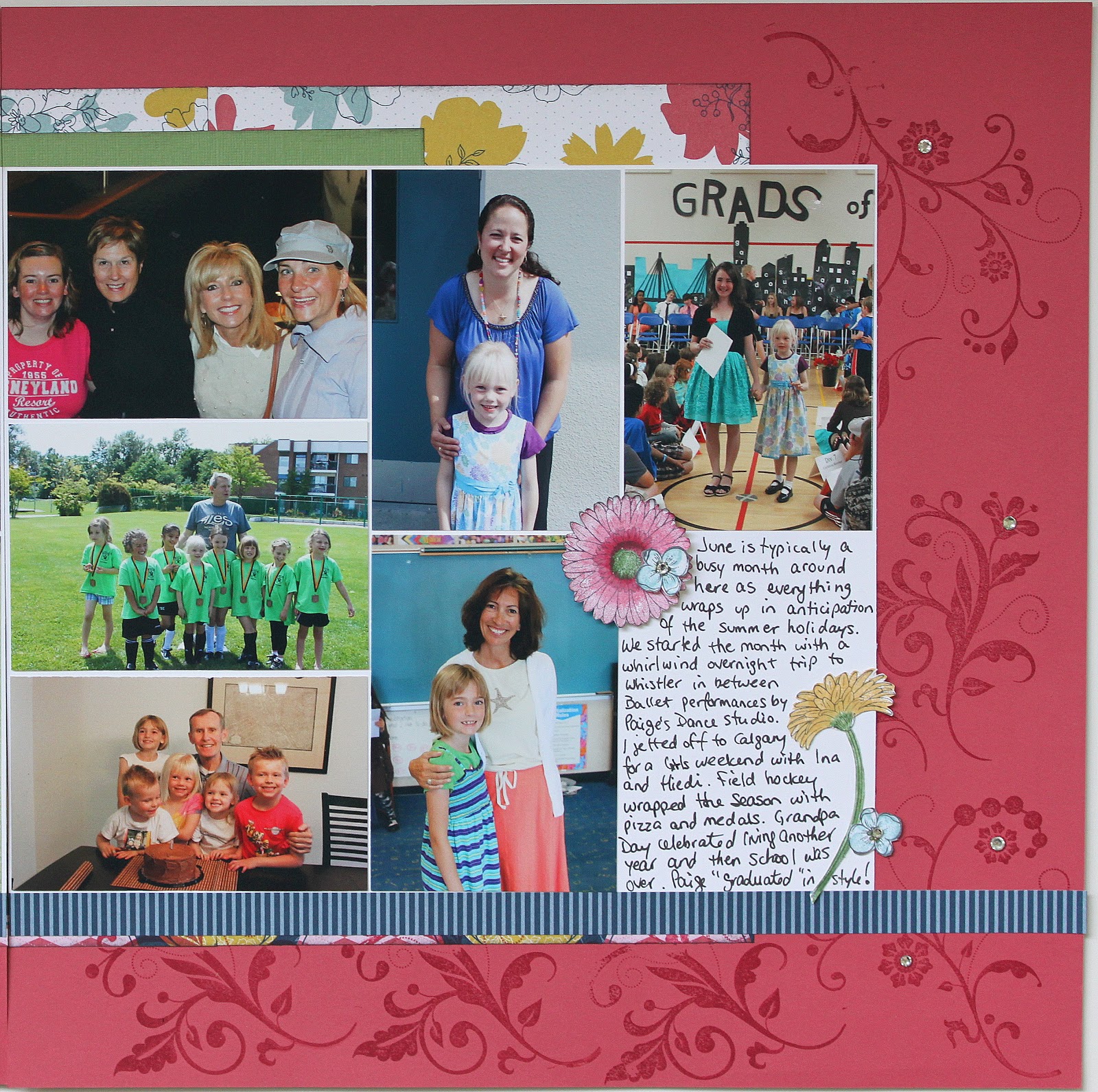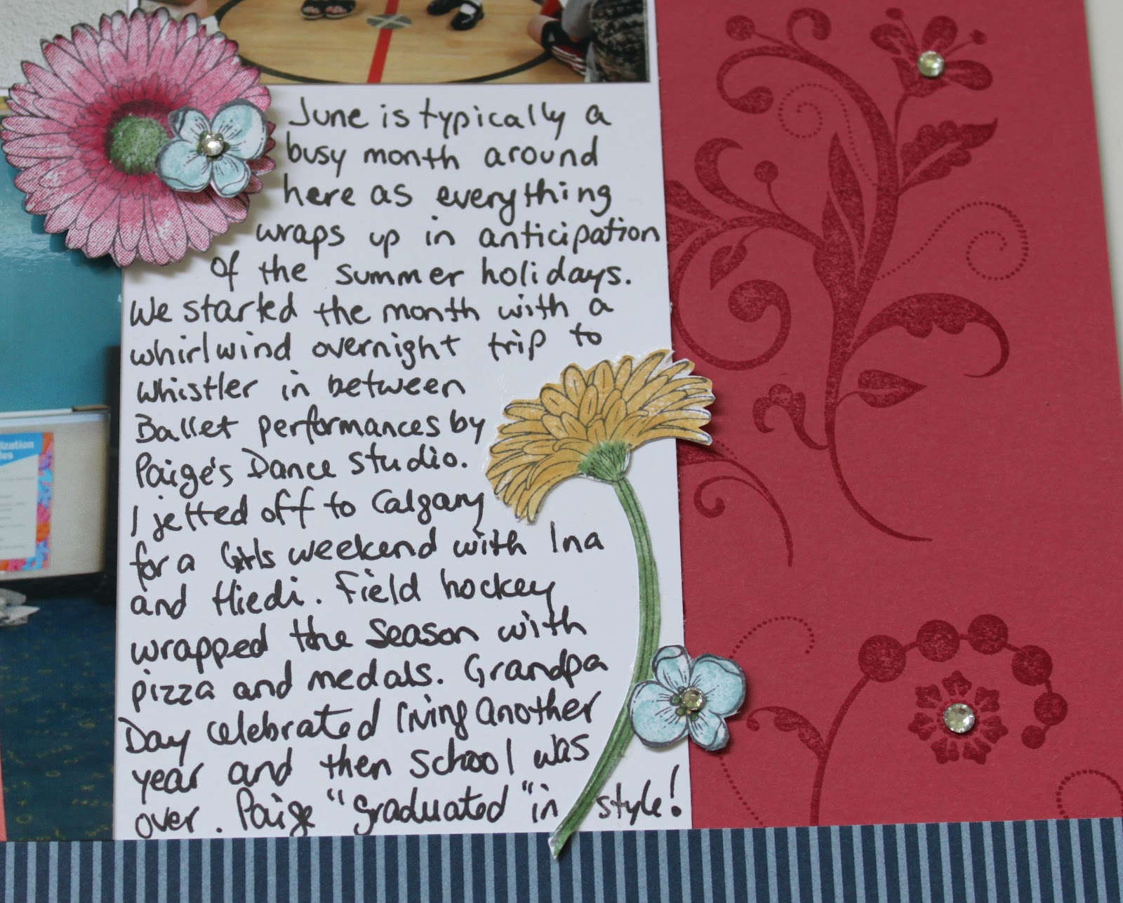 As you can see I stamped a tone on tone border on 3 sides of the layout using Flowering Flourishes. I embellished some of the flowers with rhinestones – the last thing I did to finish off this layout!