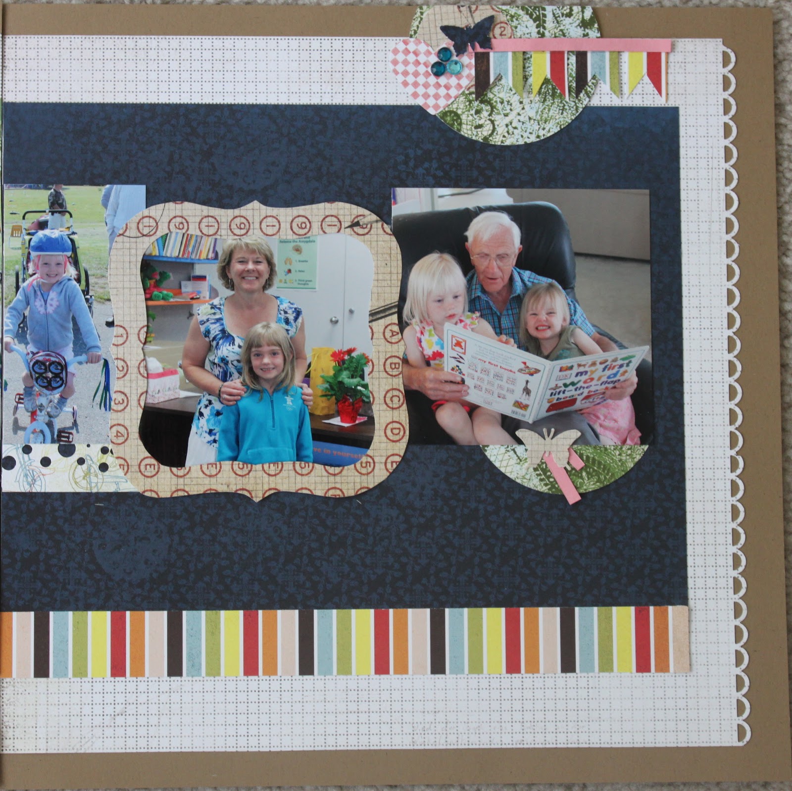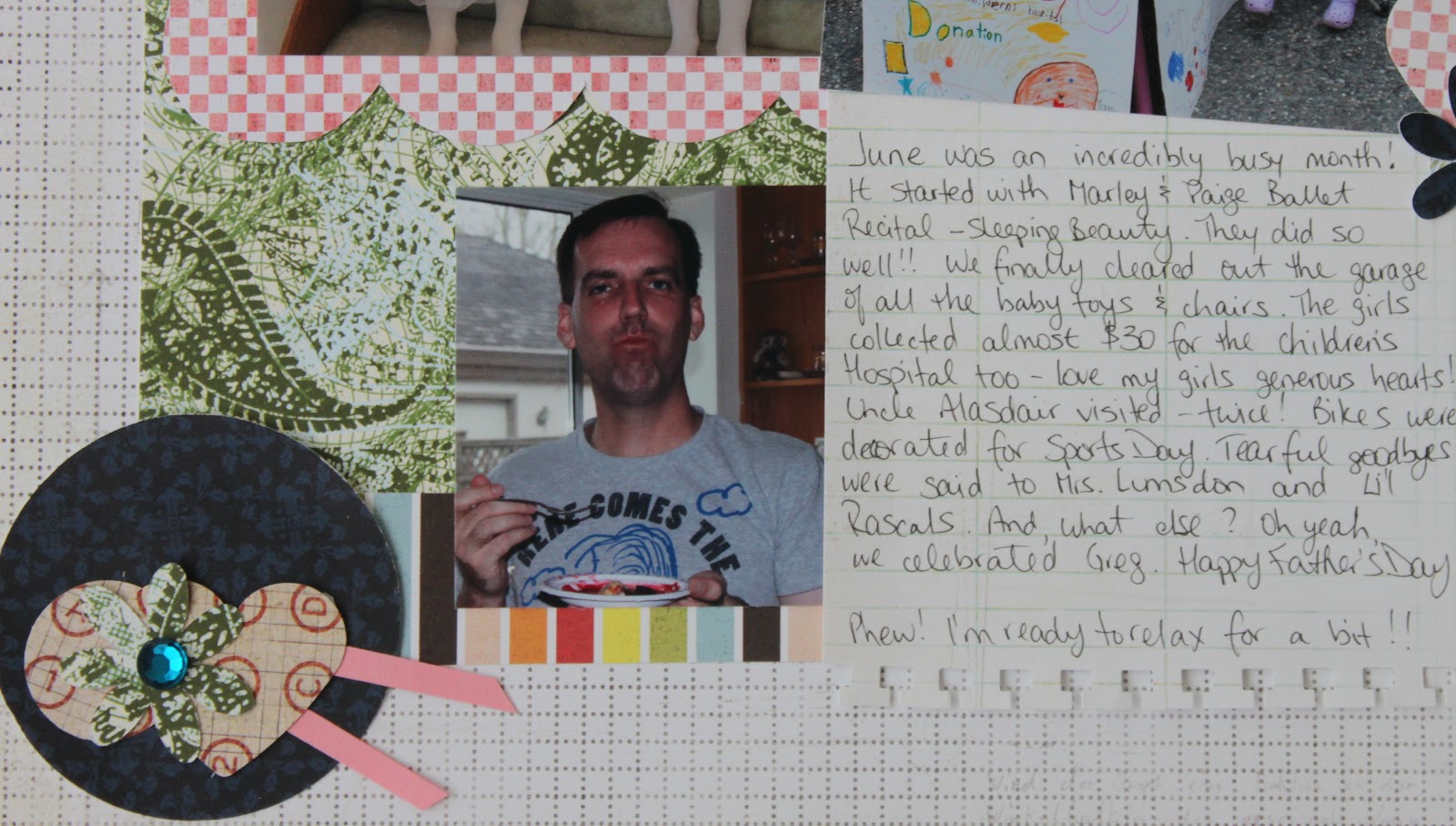 I stuck to the sketch pretty closely this month. I was testing myself to see if I could! And I can … sort of. I did add one tiny extra picture – of Greg since Father’s Day was last month!