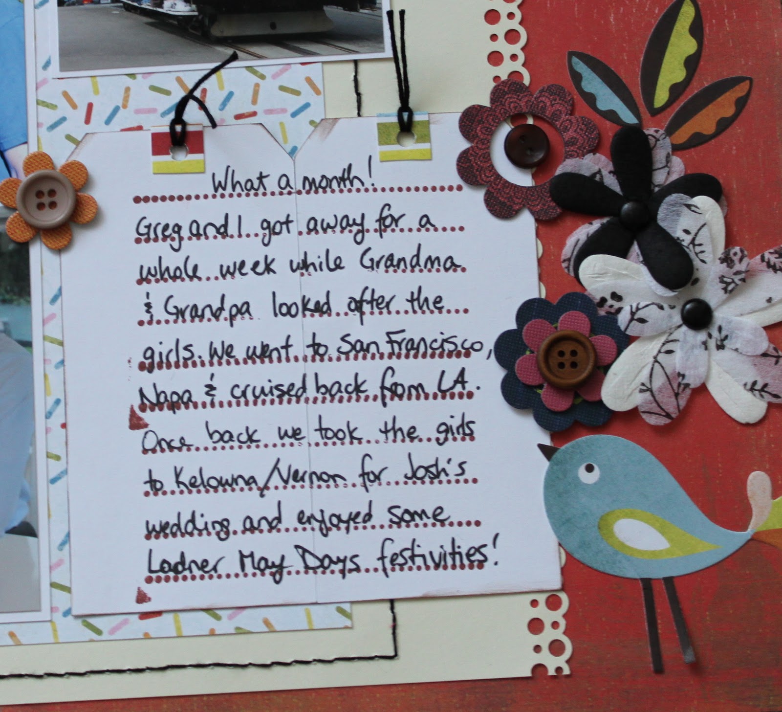 I actually made the shipping tags using a Staples one as a template. I butted them next to each other and then stamped my journalling lines. I used some of the striped paper at the top and punched my holes through it. The embroidery floss tied through the top is the same as that which I used on the hand stitching. I had fun with my embellishments too! I liked the row of flowers in the sketch but my journalling was there so I grouped some flowers on the right and then used some BG Elements stickers. Like the birdie?