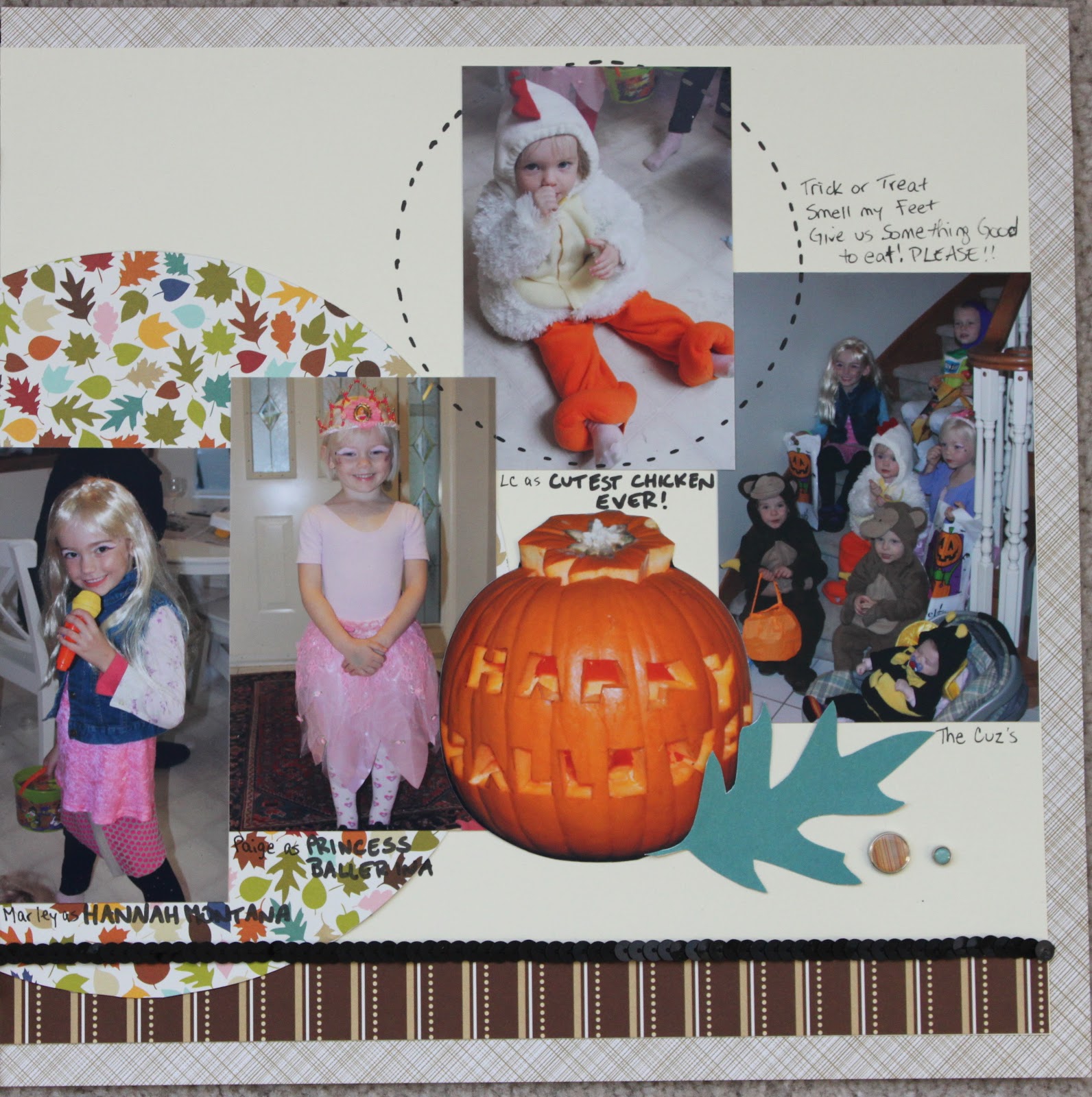 A couple of comments about my process this month … if I may! It’s hard to tell from the picture above, but that black strip along the bottom is actually a sequined ribbon that I came across in my stash. I was looking for a blue ribbon to compliment the blue journalling strip but … somehow this one was a better fit. The striped paper and the leaf paper are Bella Blvd (FINALLY got to use some Bella!) and when I went looking for some blue embellishments to tie in the blue journalling strip, I came across the oak leaf and the “Fall Fun” title sticker. Once those were added the layout really seemed complete.