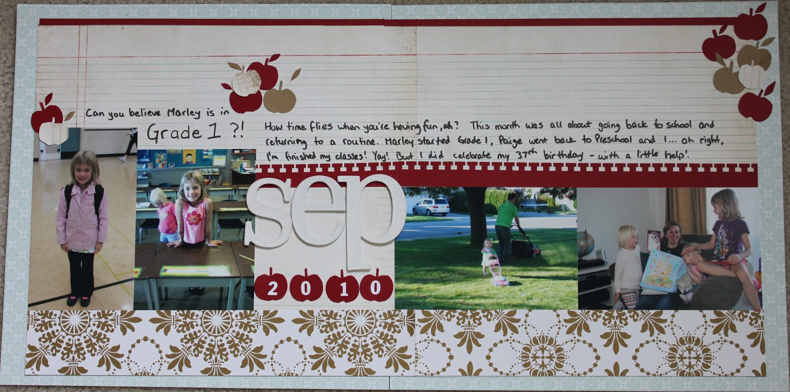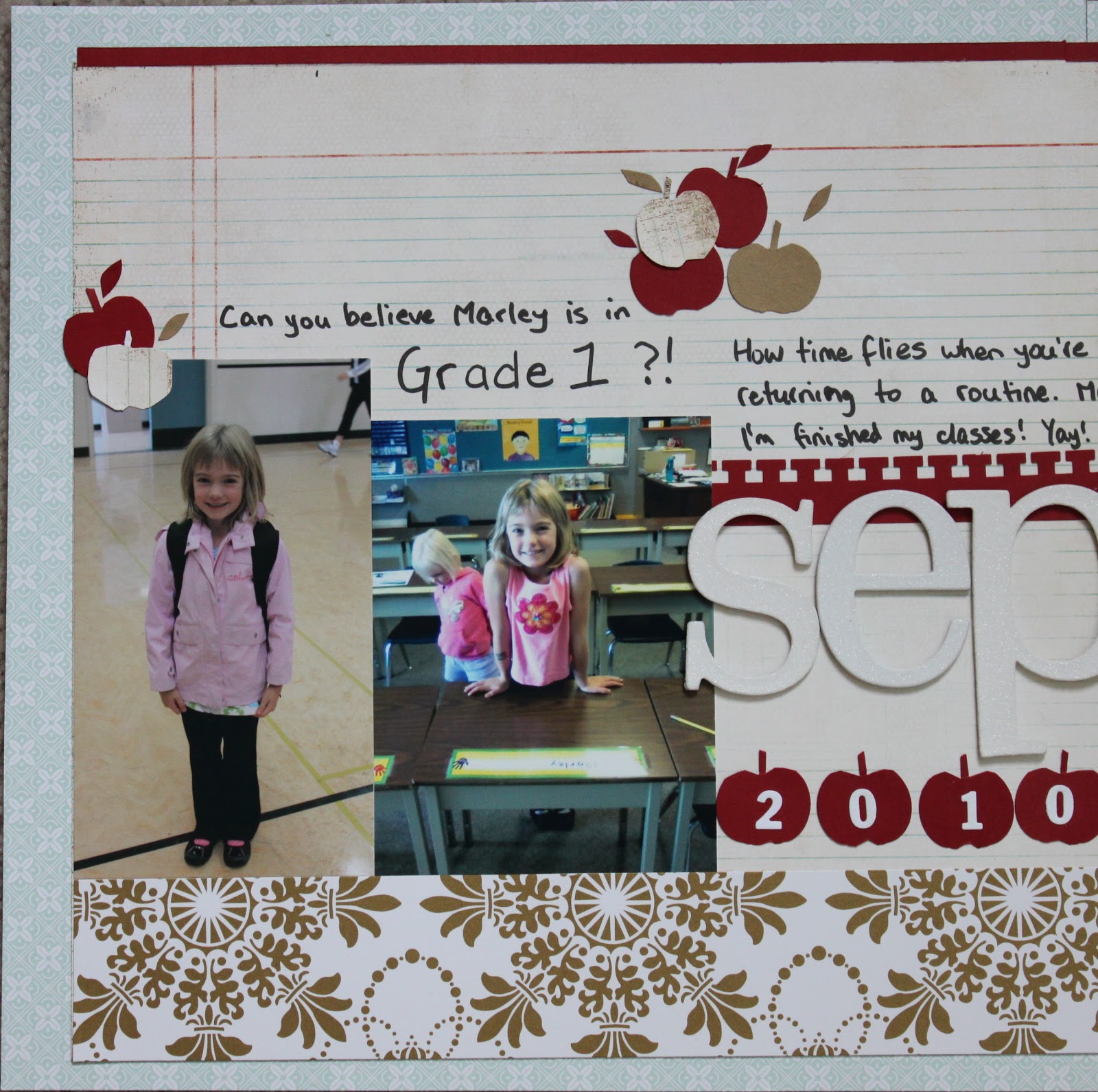 Here is a close up of the left-hand page. I made a few changes (natch!) to the sketch. The lined paper (which is my nod to back to school) seemed to cry out to be journalled on directly so I didn’t add the extra journalling section. I then decided that my title fit nicely in the middle of the row of pictures – although, I have now noticed that in order to cut the page in two I will have to move the large month letters as they are hanging over the middle. Oops! And of course I couldn’t actually stick with the sketched 3 pictures!! The two of Marley starting Grade One HAD to be there!!