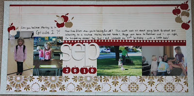 Here is a close up of the right-hand page. I didn’t journal about Greg and LC mowing the lawn together. I’ve blogged about it and it just didn’t seem to need any additional comments here. September really was all about the girls heading back to school and us getting back into a routine. Even my birthday was sort of an after thought. And since I was my own photographer, the pictures from my birthday party don’t actually have ME in them. Sorry honey, I love you, but you are not pulling your weight in the documenting our family department!! 🙂