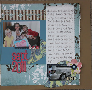 The right hand page features a picture (that I love!) of me with my girls on my birthday. Tucked down in the corner is a picture of our van after Greg and the girls were hit by someone running a red light at a nearby highway intersection. SO blessed it was not more serious! I do want to remember the incident though as it really impacted us for several weeks so in the layout it goes!