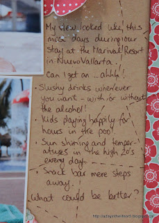 The back ground patterned paper is from Teresa Collins’ Spring Fling line (which I received as part of a blog hop prize from Sheila ages ago.) I have been using a lot of the papers when scrapping our recent trip to Puerto Vallarta as the colours are so perfectly tropical!