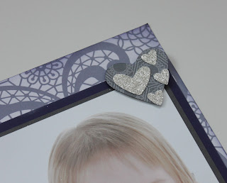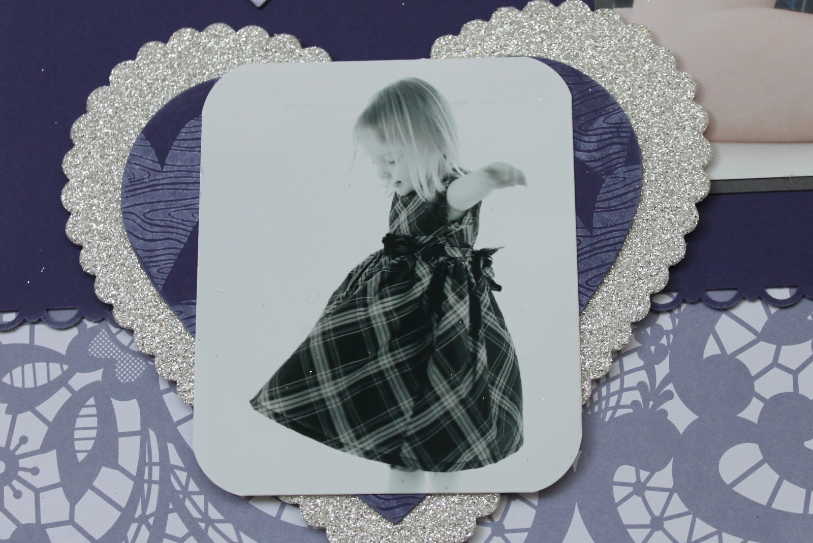 I mounted this small black and white photo onto a piece of Concord Crush card stock and Silver Glimmer Paper that I cut out using the Hearts Collection Framelits Dies. Onto the card stock I stamped the wood grain heart image from I {Heart} Hearts in Whisper White Craft ink. I love the subtle pattern it gives.