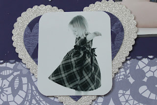 The background paper is from the Flirtatious Specialty DSP line – a gorgeous girly line! I inked the edges in Concord Crush ink for a slightly distressed look. I used a piece of Basic Grey card stock to mat the larger photo of my youngest daughter and then put that on top of a large piece of Concord Crush card stock. I ran my Scallop Trim Border Punch along the bottom of this for a bit more detail.