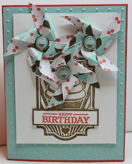 I started with a piece of Calypso Coral card stock then layered a piece of Pool Party card stock that I’d run through my Perfect Polka Dots Textured Impressions folder on my Big Shot. On top of that is a piece of Whisper White card stock stamped with the Sweet Cake stamp set and dressed up with my fun pinwheels (3 of them in honour of her 3rd birthday!)