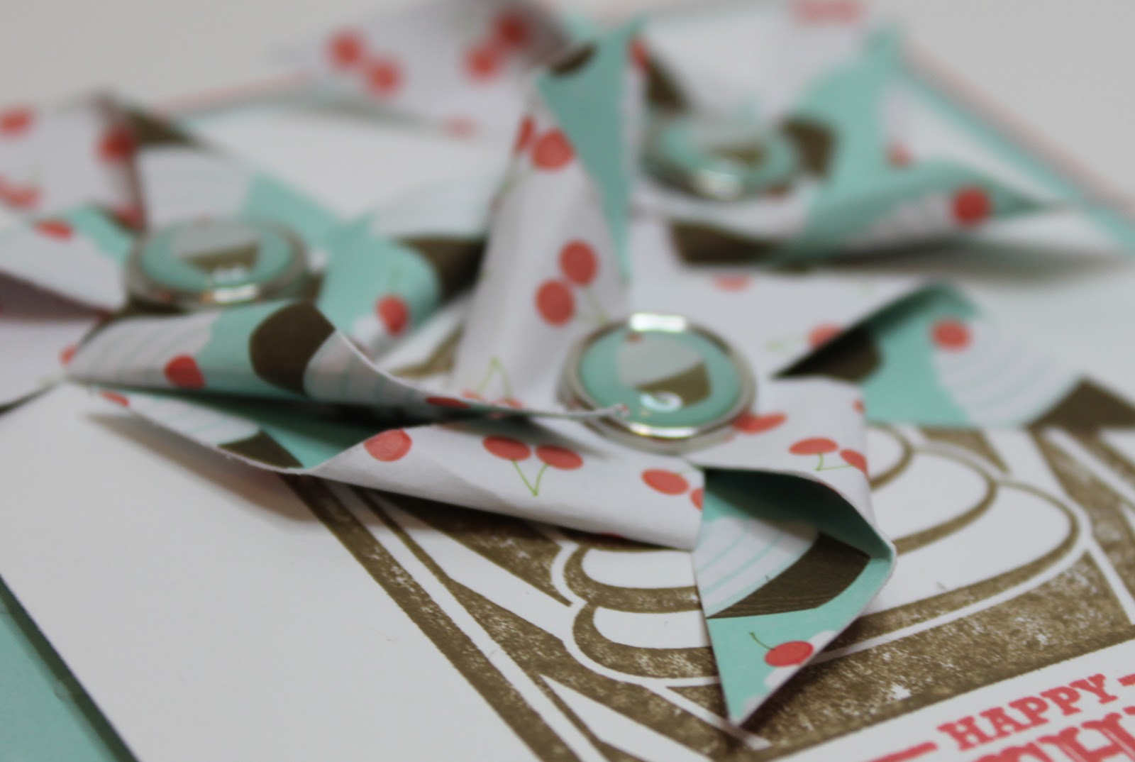 The pinwheels themselves are made out of pieces of the Sweet Shop DSP and are held in place with a brad from the Sweet Shop Jelly Bean brads.