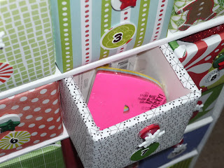 Here are close ups of the drawer embellishments. I managed to find a pack of Christmas paper so big that each drawer has a unique paper pattern. No repeats! Some of the “handles” are hotglued on (they are all buttons on top of buttons) and some are glued on with big fat glue dots. We’ll see which method survives the longest!!