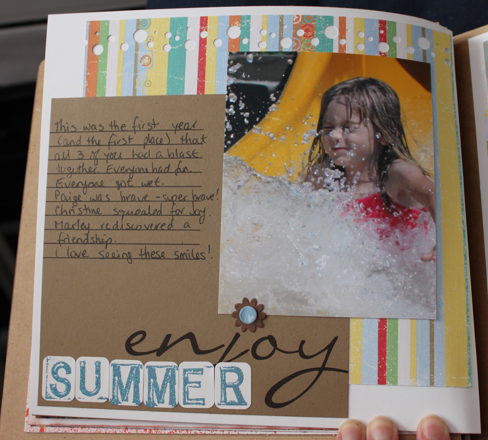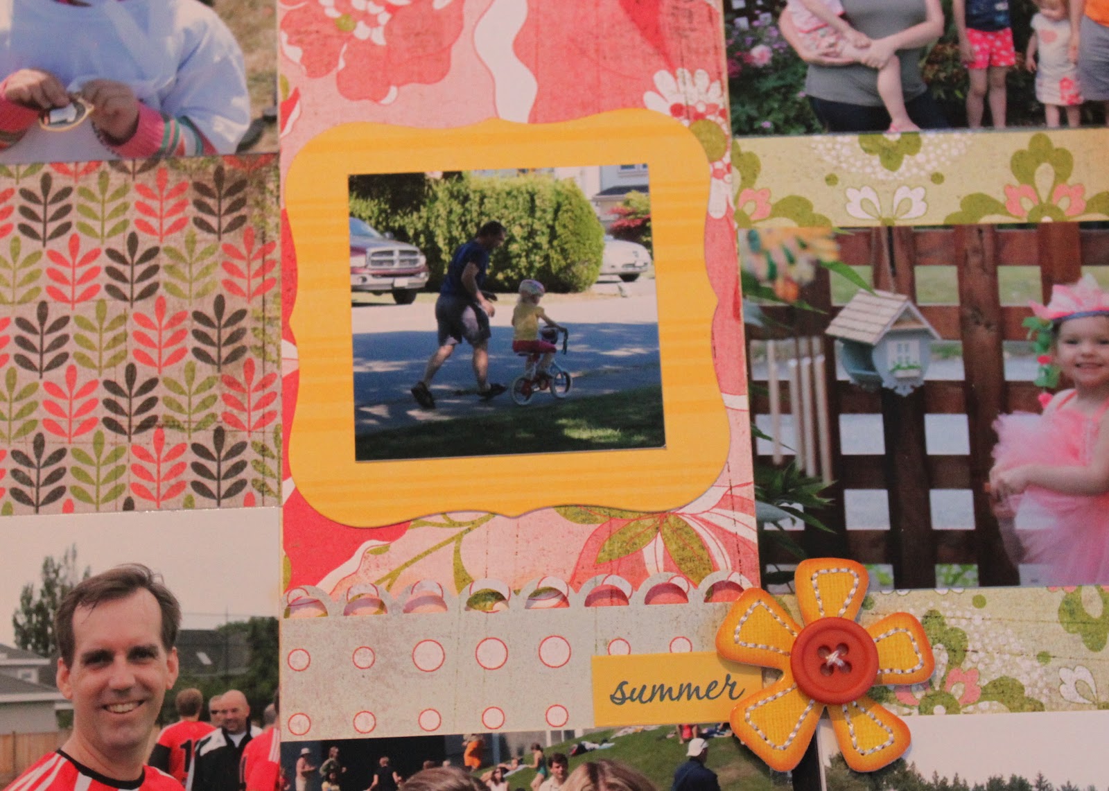 I wanted to bring attention to the little picture I had of Paige riding her bike without training wheels so I framed it in yellow. That sort of was the jumping off point for all the yellow accents on the page. Originally I wanted to include a picture of Paige on a bright yellow waterslide but it didn’t work with the layout (one too many pictures if you can believe that!) but I think I had yellow stuck in my mind. Anyway. I like it. It adds a touch of sunshine to the summer themes.