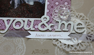Last but not least is the embellishment cluster behind the title. One of the smaller doilies from Delicate Doilies in Whisper White with a couple vellum ones over top. Another couple Vintage Faceted buttons, some more ribbon to ground everything and a little hand written label that adds a bit to the title.