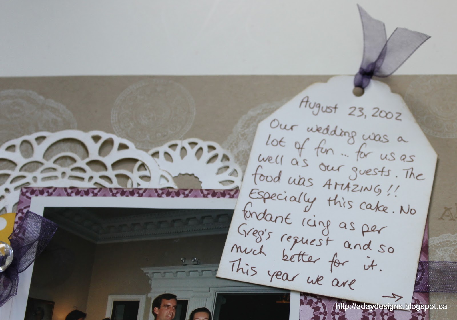 I cut out several different doilies using the Delicate Doilies and Paper Doily Sizzlits. I cut them out in both Whisper White and Vellum intending the layer them. In this picture you can see the large Paper Doily with a smaller doily from the Delicate Doilies both tucked behind the picture block. The purple ribbon is also not from Stampin’ Up – it’s actually leftover from creating our wedding invitations! I accented the bow with one of the Vintage Faceted Designer buttons. The yellow heart behind is punched from Echo Parts Dots and Stripes and is my Twelve embellishment indicating that this layout was based on some sort of Inspiration. (Yellow is my Inspiration colour.)