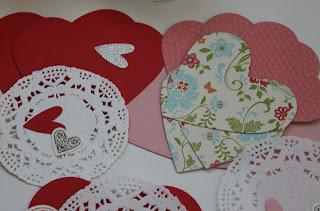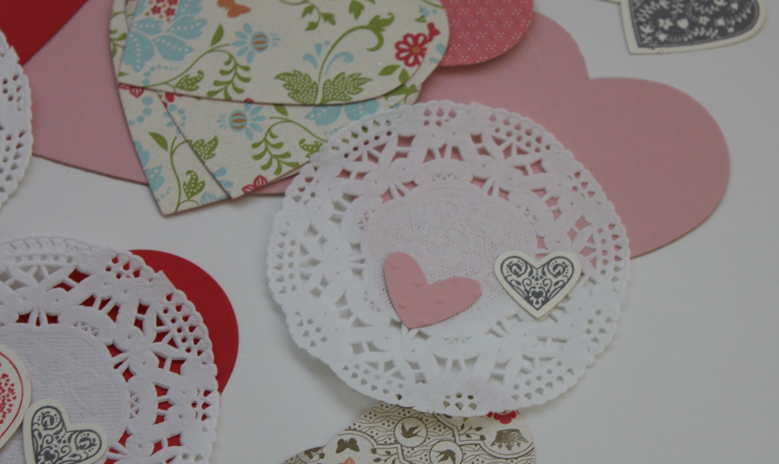 Choose your background heart colour, add a doily, stamp away and glue on some hearts.